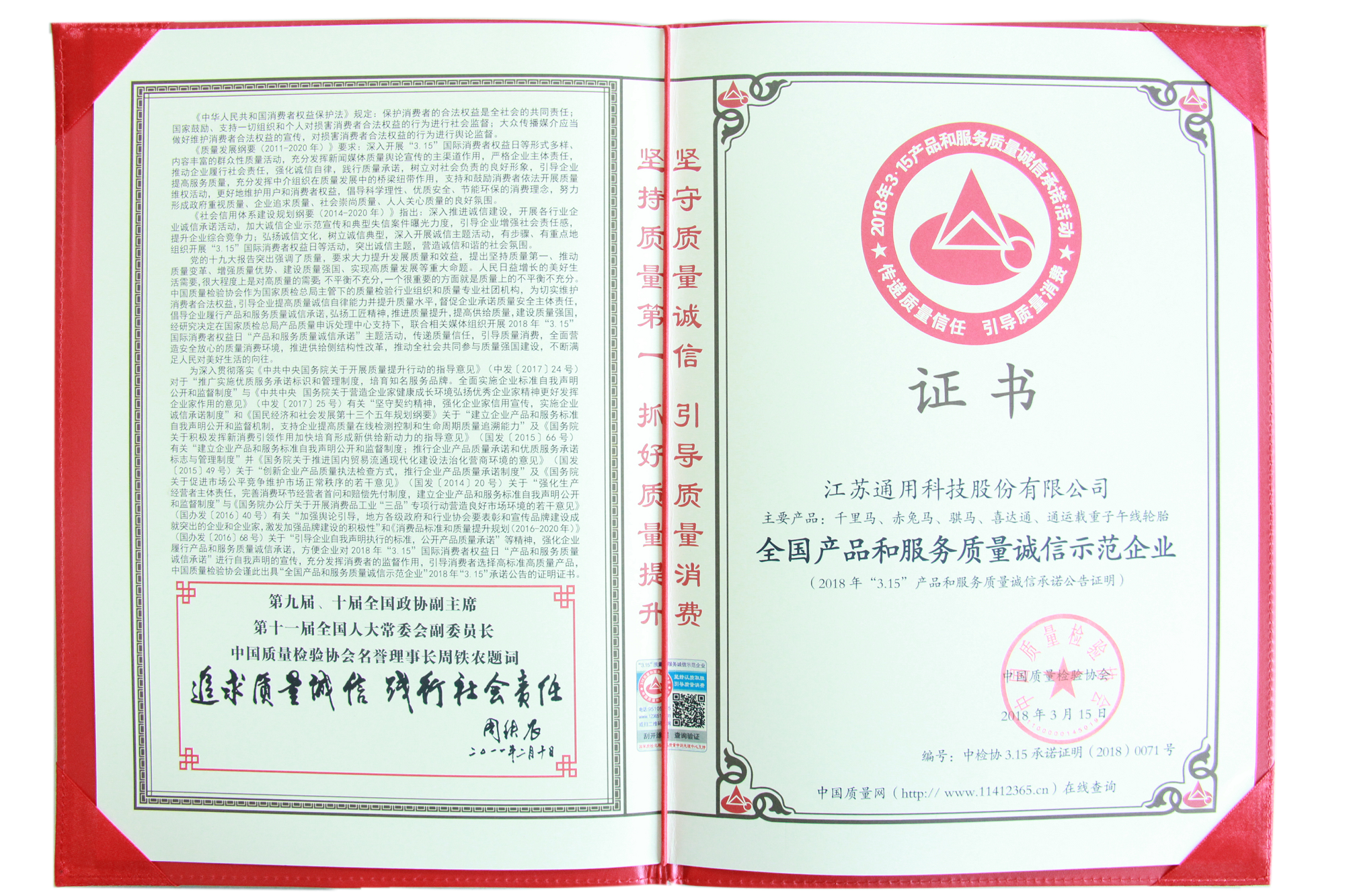 江蘇通用科技股份有限公司自創(chuàng)建以來,高度樹立“產(chǎn)品即人品”的經(jīng)營理念,緊緊圍繞“全員追求卓越、匠心打造精品”的質(zhì)量方針,致力于為消費(fèi)者提供更優(yōu)性價(jià)比的輪胎產(chǎn)品。近日,通用股份憑借旗下五大品牌的卓越品質(zhì)以及真誠服務(wù),在由國家質(zhì)檢總局和中國質(zhì)量檢驗(yàn)協(xié)會(huì)聯(lián)合開展的“產(chǎn)品和服務(wù)質(zhì)量誠信承諾”主題活動(dòng)中,榮獲“全國產(chǎn)品和服務(wù)質(zhì)量誠信示范企業(yè)”、“全國輪胎行業(yè)質(zhì)量領(lǐng)先品牌”稱號(hào),彰顯了通用股份以質(zhì)立信、誠信為本的行業(yè)操守。